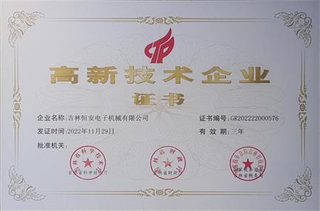 熱烈祝賀:吉林恒安電子機(jī)械有限公司在2022年吉林省科學(xué)技術(shù)廳高新技術(shù)企業(yè)評定工作中,榮獲高新技術(shù)企業(yè)證書。